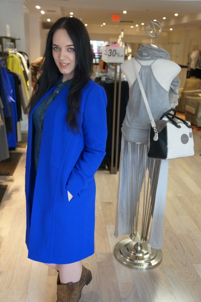 Then there’s this gorgeous coat in the best unexpected fall colour, electric blue. Another perfect example of day-to-night wear, this coat compliments almost any outfit and any body type. Its subtle details and energizing colour combine to give you a coat that will brighten up any fall, late summer, or even early winter outfit.